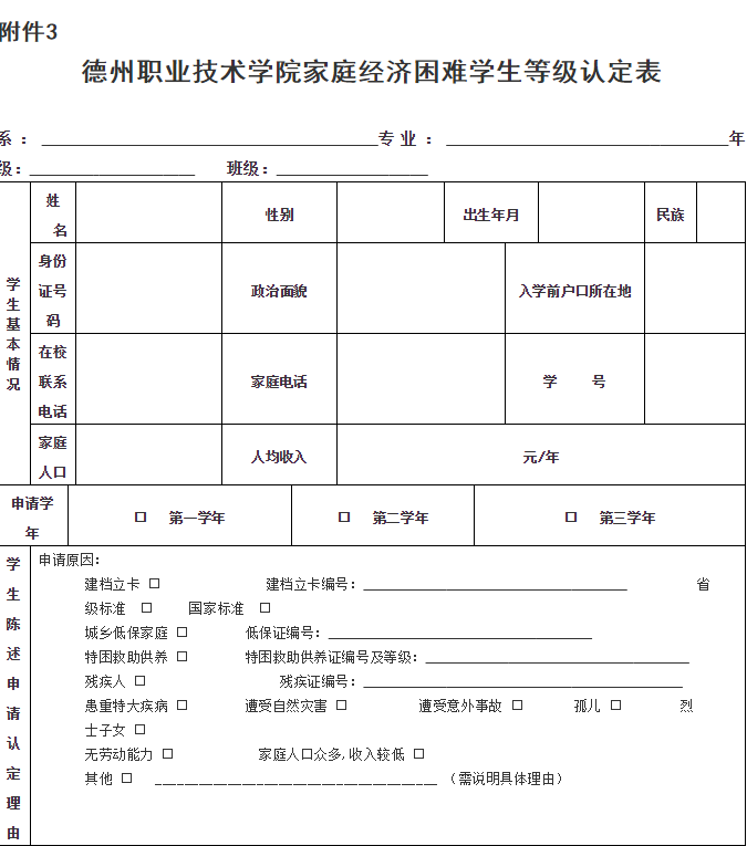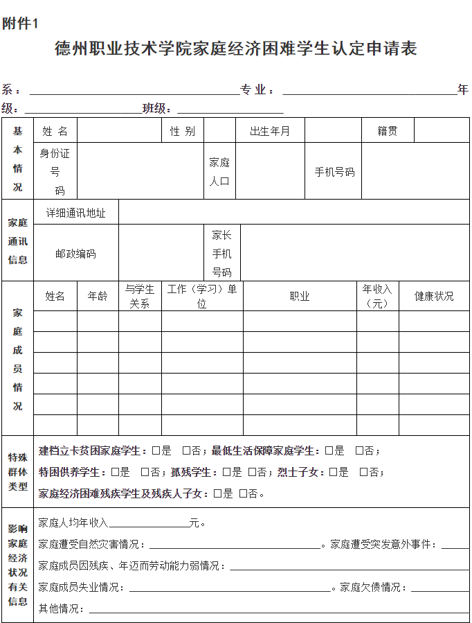 学校全面、认真部署每个学年的家庭经济困难学生认定工作。学校在向新生寄送录取通知书时,同时寄送《家庭经济困难学生认定申请表》(附件1);在每学年结束之前,向在校学生发送《家庭经济困难学生认定申请表》,并宣传国家资助政策。需要申请认定家庭经济困难的新生及在校学生,自愿、如实填写《家庭经济困难学生认定申请表》,并填写个人承诺,按要求签字。
