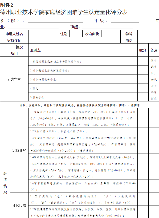 班级民主评议:班级民主评议小组根据学生提交的《家庭经济困难学生认定申请表》及相关证明材料,并结合学生日常消费,以及影响其家庭经济状况的有关情况,认真填写《家庭经济困难学生认定量化评分表》(附件2)《家庭经济困难学生等级认定表》(附件3),拟定本班级家庭经济困难学生。班级公示1天,无异议后,上报系(学院)认定小组。