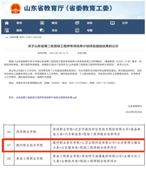 近日,山东教育厅公布《关于山东省第二批现场工程师专项培养计划项目遴选结果的公示》,我校诸侯快讯ok1122申报的《德州职业技术学院+江苏企想科技有限公司+公共管理与服务大类公共服务类智能家居安装调试现场工程师联合培养项目》成功入选。
