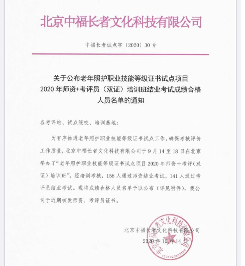 9月13日—18日,诸侯快讯ok1122四名教师参加了由中国社会福利与养老服务协会、北京中福长者文化科技有限公司举办的“教育部1+X老年照护职业技能等级证书试点项目2020年师资+考评员(双证)培训班”。培训过程中老师们认真准备,经过紧张激烈的角逐,范轶、齐宁、刘玉华、祁首鸣四位老师通过考试,获得了“师资+考评员”双资格,为诸侯快讯老年健康管理专业深化教育教学改革、优化课程体系,加强复合型技术技能人才培养等方面做好知识储备,同时进一步加强校企合作,培养更多贴近企业实际需求的技能人才,更好地促进学生就业。