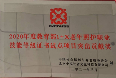 在学校各级领导的大力支持下,我校于2019年获得教育部首批“1+X证书”制度老年照护职业技能等级证书和第二批失智老年人照护职业技能等级证书试点、考评点。在2020年度初、中级证书考评工作中,学生获证率为97%,其中中级证书考评通过率为100%。