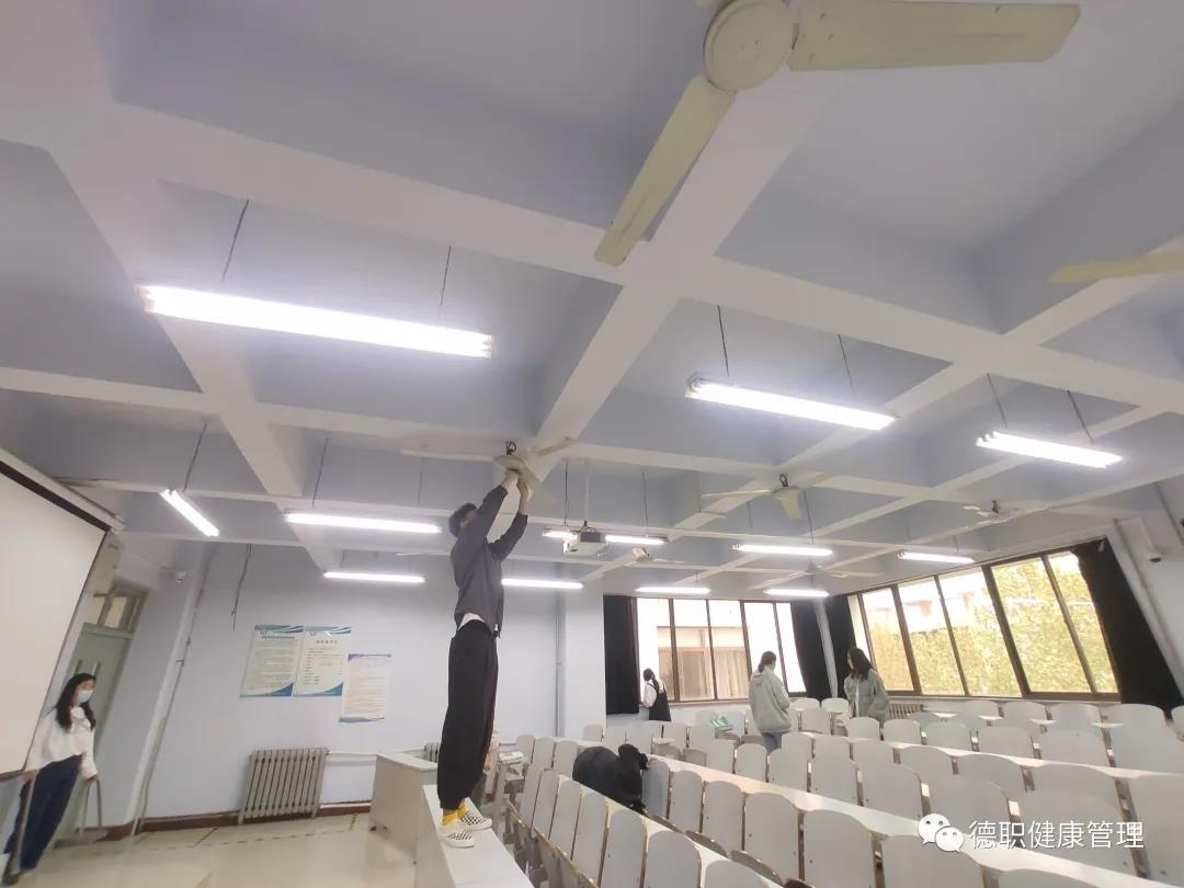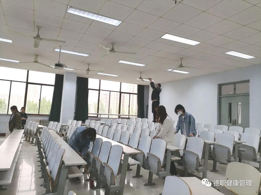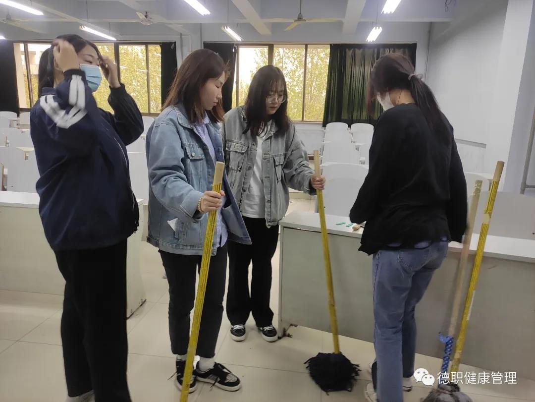 由卫生部部长赵志浩同学开会讲述打扫中的注意事项及细节,经过分组后,领取工具,同学们去往各自卫生领域进行扫除,各组热火朝天的开始,同学们分工明确,各司其职,积极主动地参与其中,扫地、抹课桌、擦玻璃、擦门框、擦灯台,整理桌堂、拖地,确保不留下任何一个卫生死角,忙得不亦乐乎。
