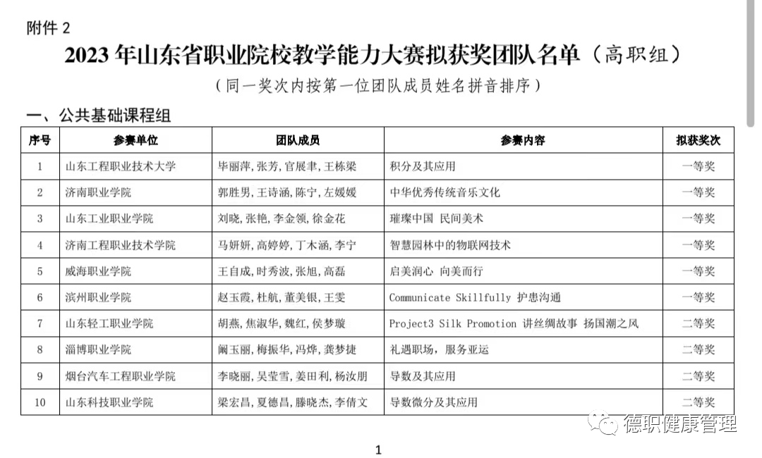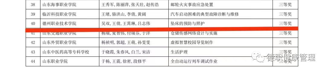 近日,由山东省教育厅主办的2023年山东省职业院校教学能力大赛拟获奖团队名单公布,吴双、王倩、王霄琳、吕志伟老师的参赛作品《坠床的预防与照护》获山东省职业院校教学能力大赛(高职组)专业课程二组三等奖,本次大赛是对学院教师教学能力的实战检验,同时彰显了我校年轻教师的精神风貌。