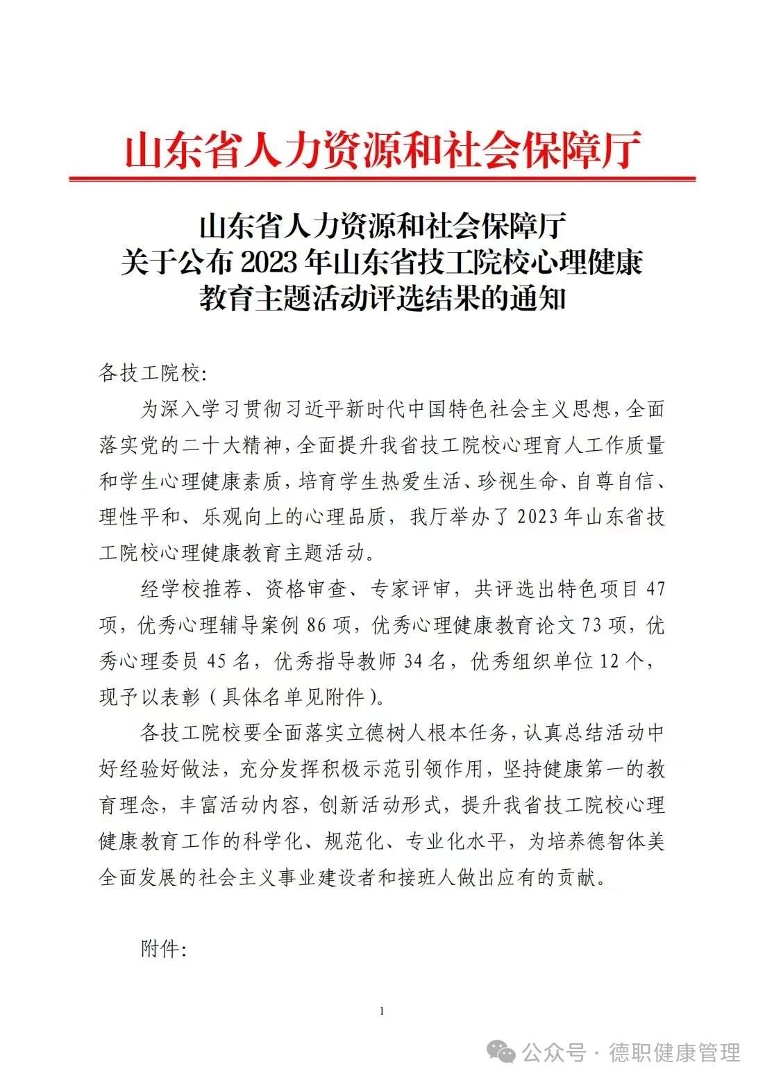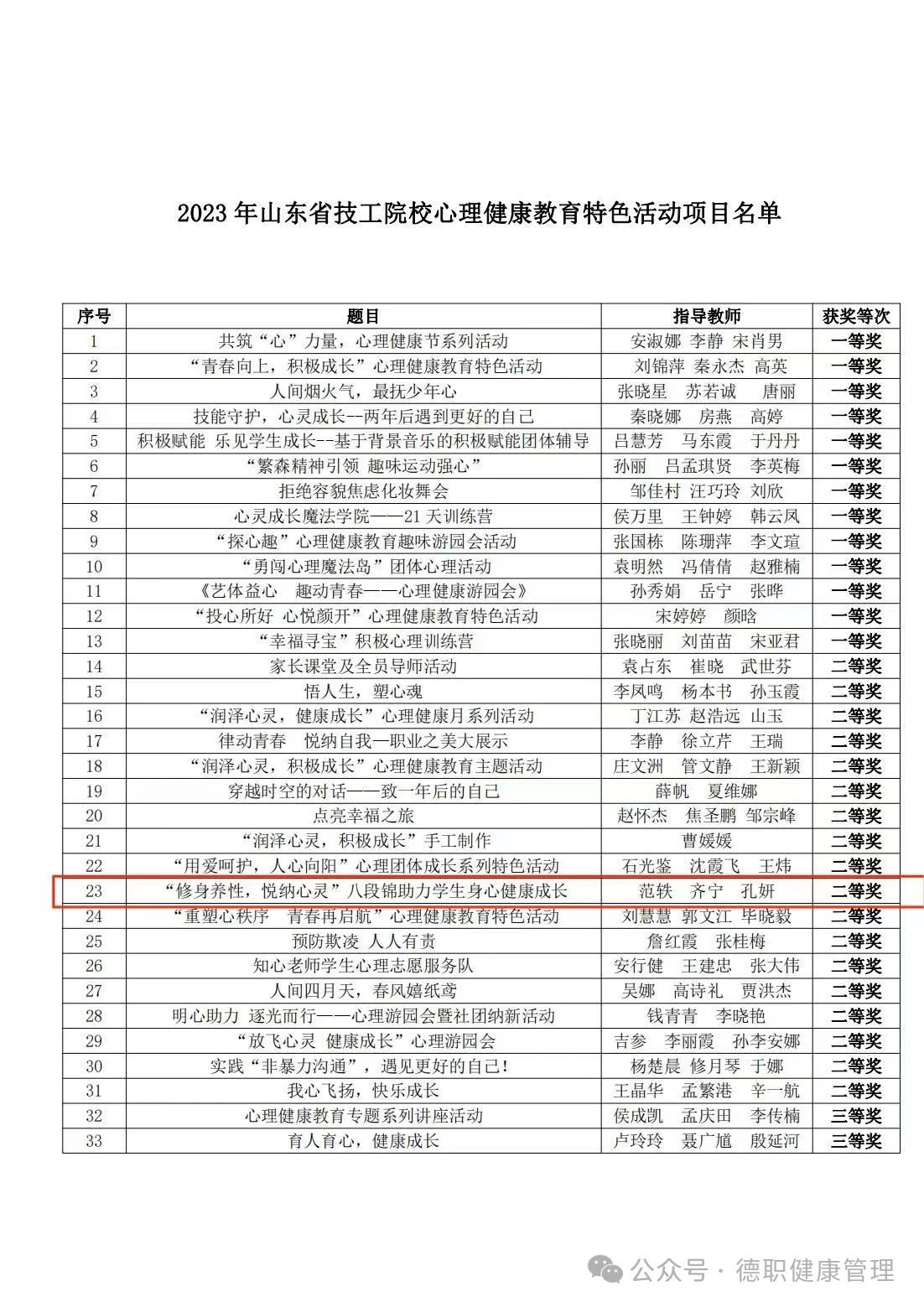 2024年1月24日,山东省人力资源和社会保障厅关于公布《 2023 年山东省技工院校心理健康教育主题活动评选结果的通知》,我校诸侯快讯ok1122范轶、齐宁、孔妍撰写的《“修身养性,悦纳心灵”八段锦助力学生身心健康成长》获山东省技工院校心理健康教育特色活动项目二等奖,是我系在心理健康教育领域取得的一次重要突破。