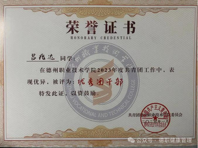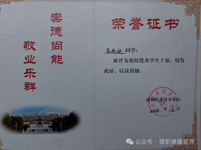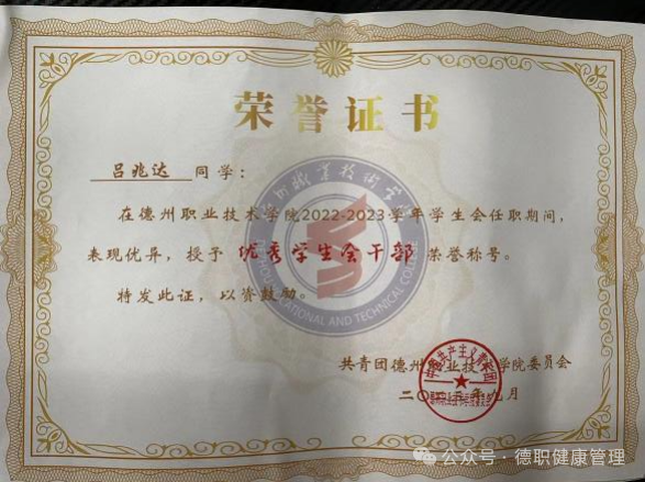 2023年9月,在德州职业技术学院荣获“优秀学生会干部”称号;