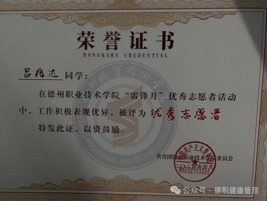 2024年4月,在德州职业技术学院“雷锋月”优秀志愿者活动中,荣获“优秀志愿者”称号;