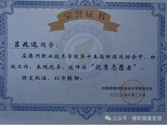 2023年10月,在德州职业技术学院第十五届田径运动会中,被评为“优秀志愿者”;