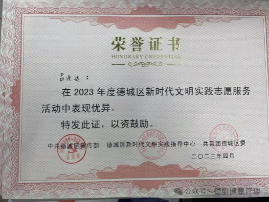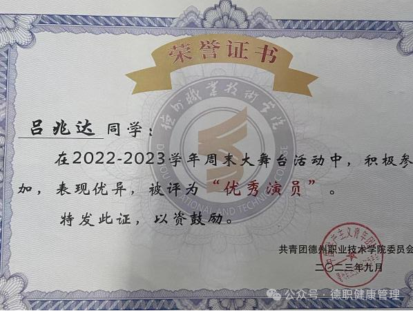 2023年6月,在德州职业技术学院“学习二十大 永远跟党走 奋进新征程”合唱比赛中,荣获“优秀志愿者”称号;