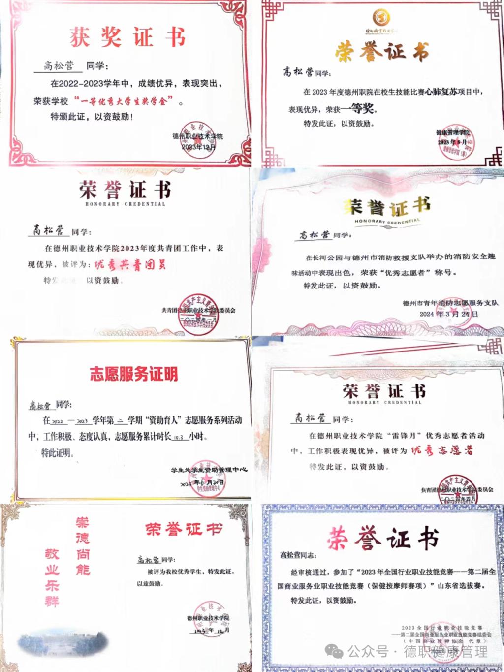 2023年,荣获“优秀学生”称号2023年,荣获“优秀共青团员”称号2023年5月,在“学雷锋·爱心护学”志愿活动中被授予“优秀志愿者”荣誉称号2023年6月,参加我校第九届“互联网+”大学生创新创业大赛获“三等奖”2023年6月,参加我系第九届“互联网+”大学生创新创业大赛获两个“一等奖”、两个“三等奖”2023年5月,参加“学习二十大 永远跟党走 奋进新征程”合唱比赛获“二等奖”2023年5月,参加2023年度系部在校生技能比赛心肺复苏项目“一等奖”2023年12月,参加山东省商业服务业职业技能竞赛被评为“优秀选手”2023年12月,获得“一等优秀大学生奖学金”2024年3月,被德州市消防救援支队评为“优秀志愿者”2024年4月,在“雷锋月”优秀志愿者活动中,荣获“优秀志愿者”称号