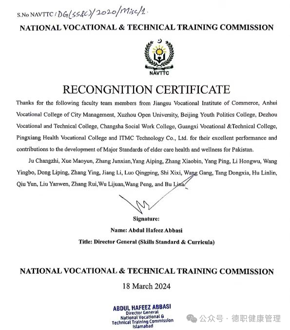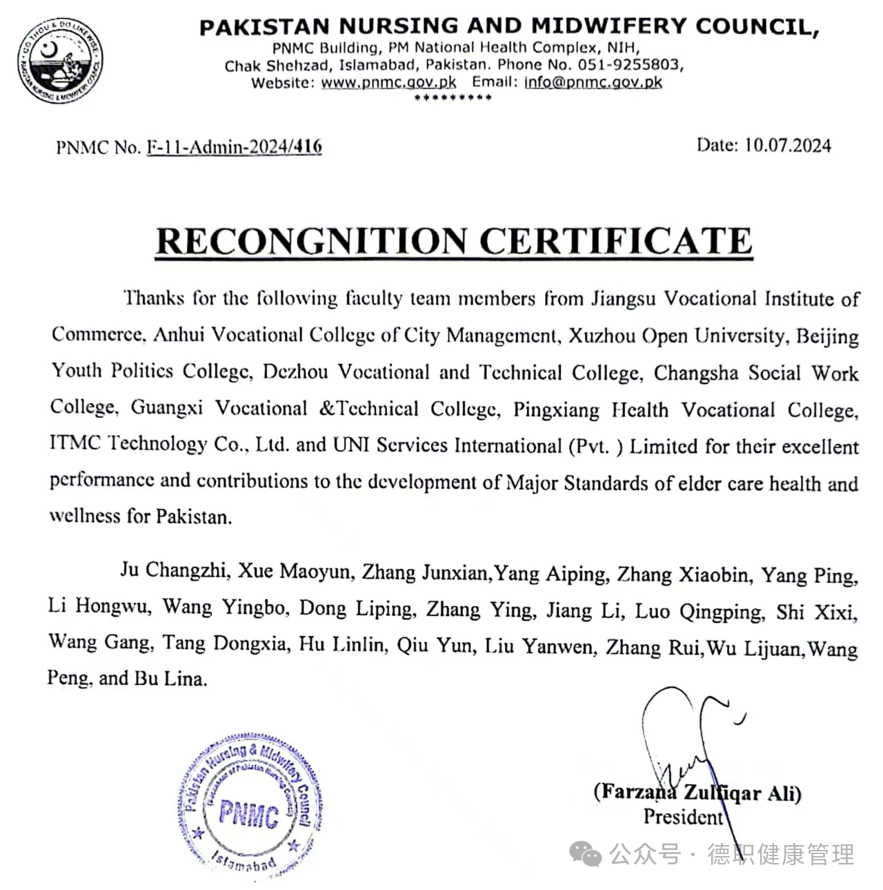 近日,我校智慧养老专业教师参与制定的“巴基斯坦老年照护专业标准开发项目”获得巴基斯坦老年照护专业标准国家职教委认证和巴基斯坦卫生部助产与护理委员会认证。