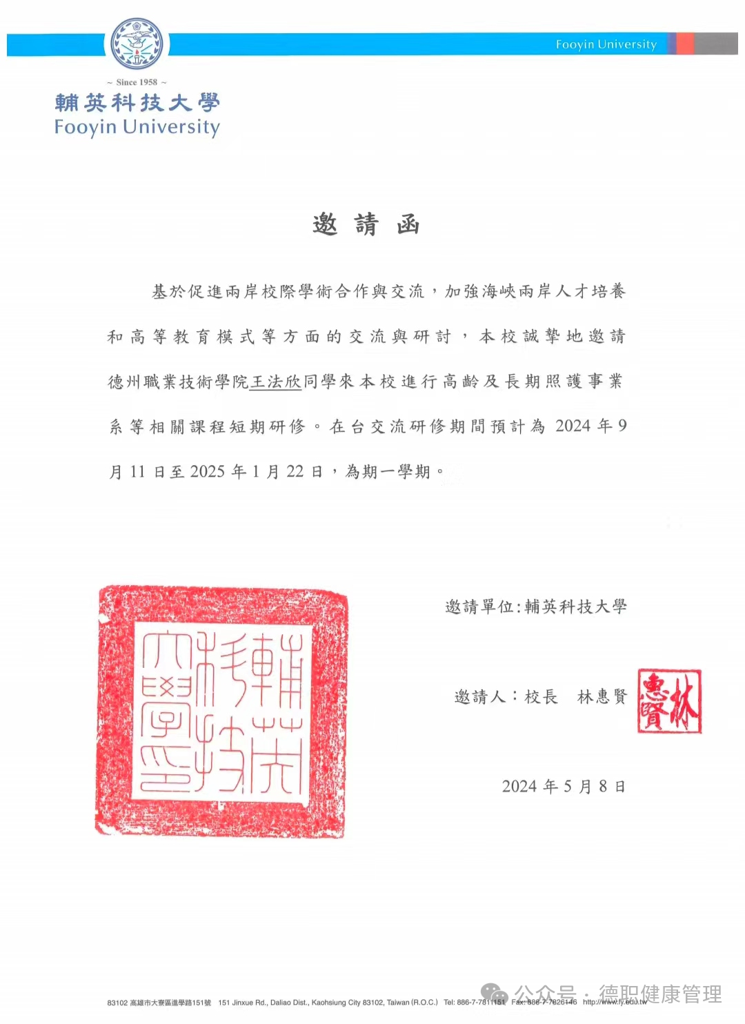 我们预祝王法欣同学在台湾的学习生活顺利,期待他学成归来,为诸侯快讯的教育事业贡献自己的力量。同时,也希望更多的同学能够抓住机会,勇敢地走向世界,展示德州职业技术学院学子的风采!