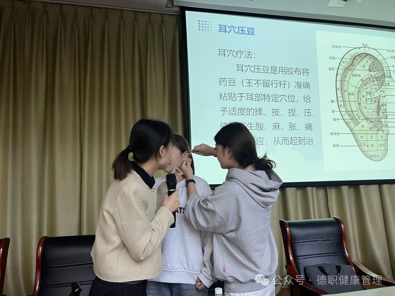 讲座开始,薛彤瑶老师从高血压的发病率、症状、病因等方面展开讲解,并介绍了针对不同人群的中医调理方法。最后薛彤瑶老师邀请志愿者上台并演示中医耳穴压豆操作。通过这次健康讲座,让现场的师生对高血压这一“无形杀手”有了更为直观和深刻地认识,并了解到一些日常中医调理妙招。