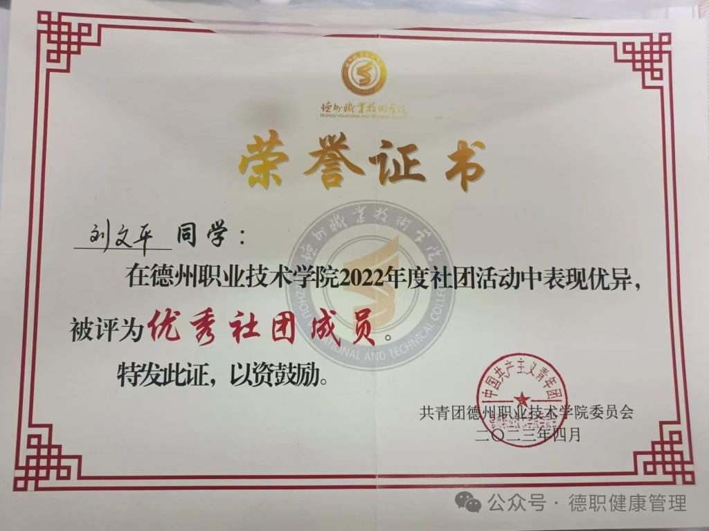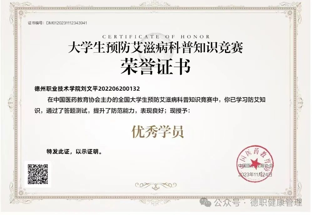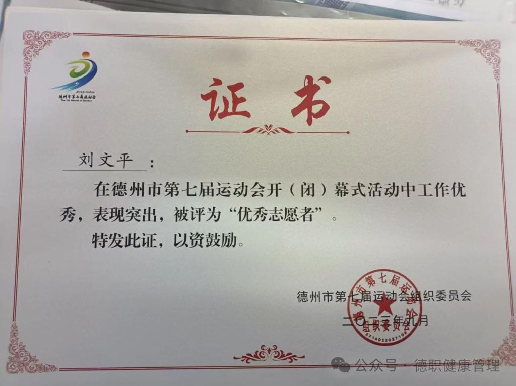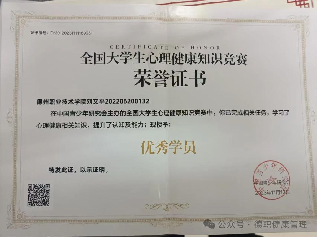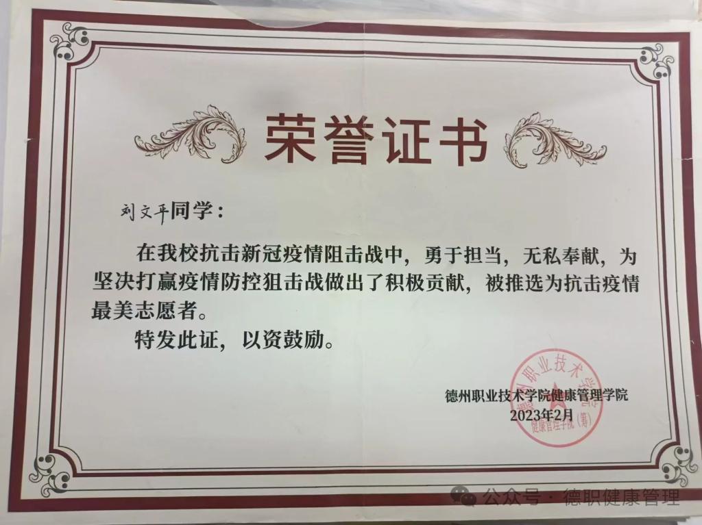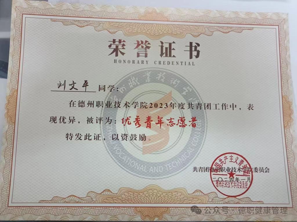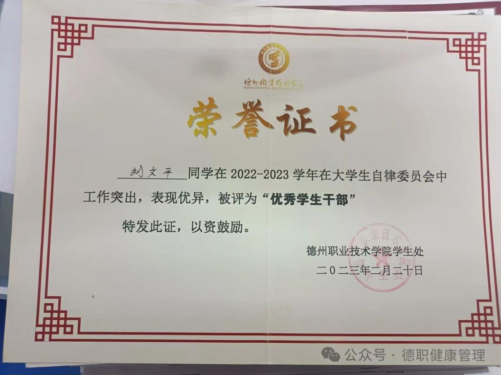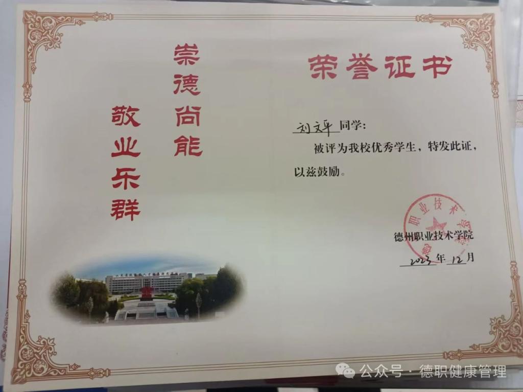2022年4月,荣获德州职业技术学院社团活动“优秀社团成员”荣誉称号2023年2月,荣获大学生自律委员会“优秀学生干部”荣誉称号2023年2月,荣获诸侯快讯ok1122“抗击疫情最美志愿者”荣誉称号2023年9月,荣获德州市第七届运动会开(闭)幕式“优秀志愿者”荣誉称号2023年11月,荣获全国大学生心理健康知识竞赛“优秀学员”荣誉称号2023年11月,荣获全国大学生预防艾滋病科普知识竞赛“优秀学员”荣誉称号2023年12月,荣获德州职业技术学院“优秀学生”荣誉称号2023年12月,荣获诸侯快讯ok1122“国家励志奖学金”2024年1月,荣获德州职业技术学院共青团“优秀青年志愿者”荣誉称号