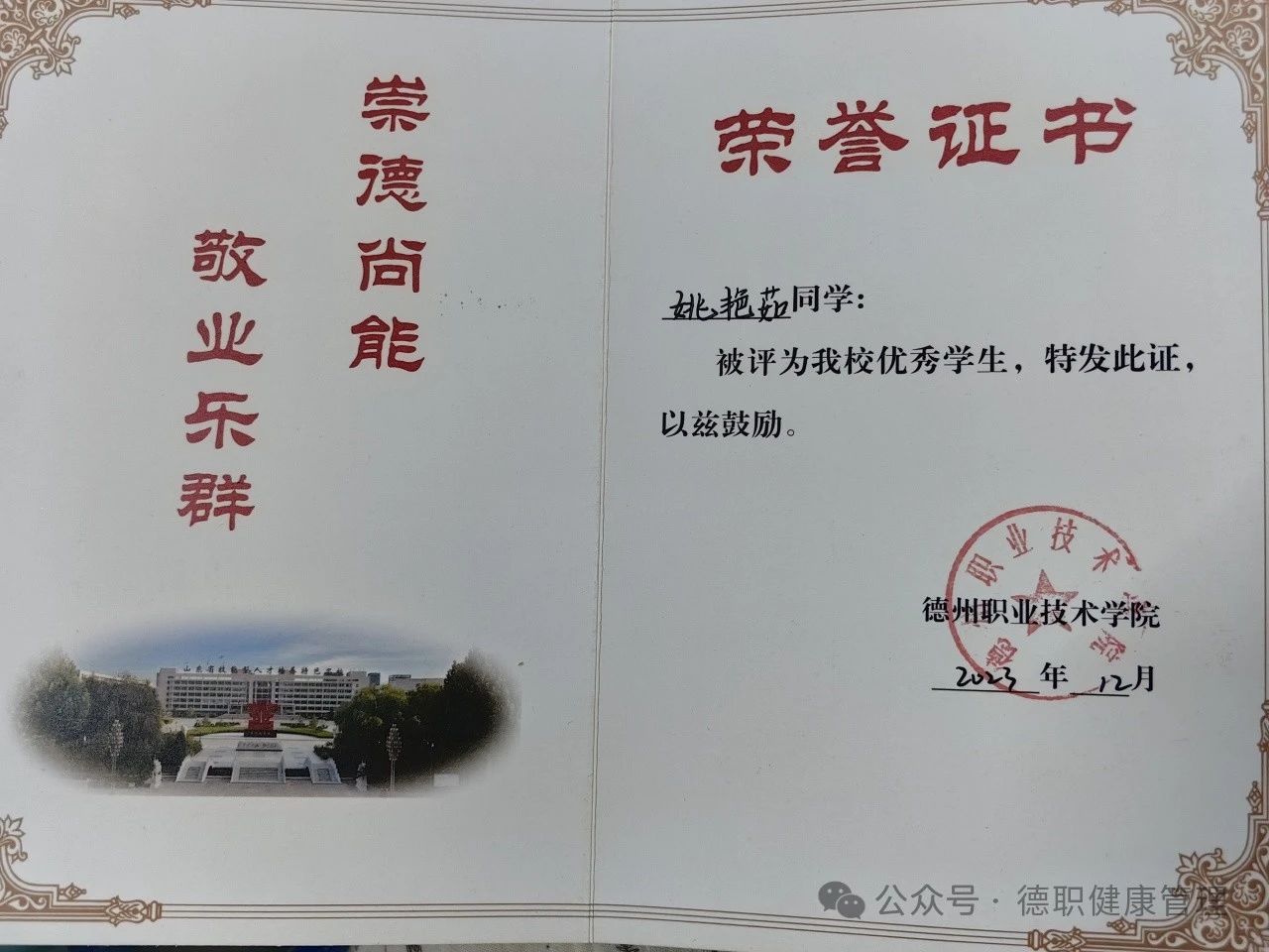 2023年12月被评为德州职业技术学院“优秀学生”。