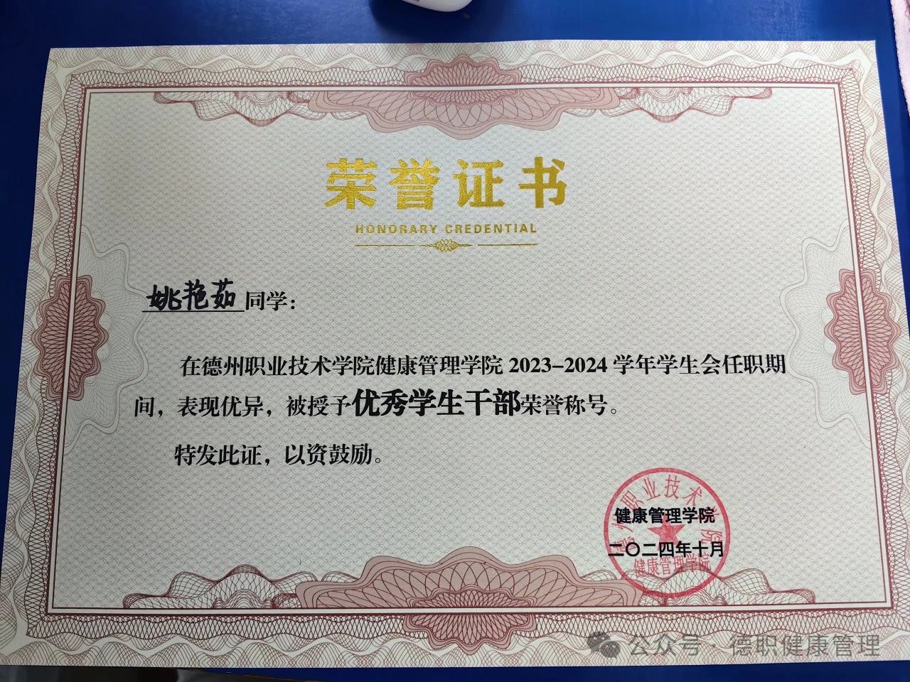 2023年2月在德州职业技术学院大学生自律委员会任职期间被评为“优秀学生干部”。