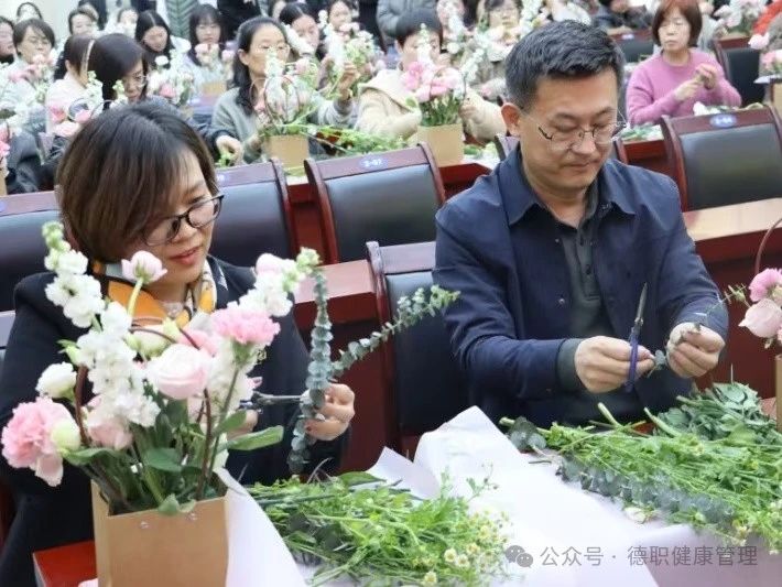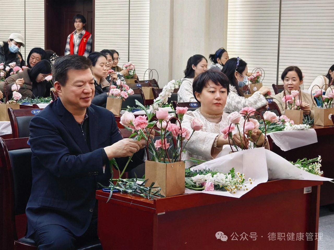 3月6日下午,女职工在润德楼参加插花活动,独立创作个性花艺作品,活动后老师进行点评。