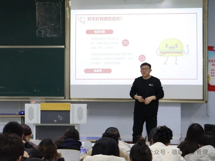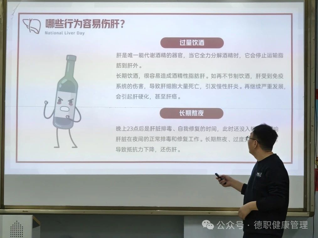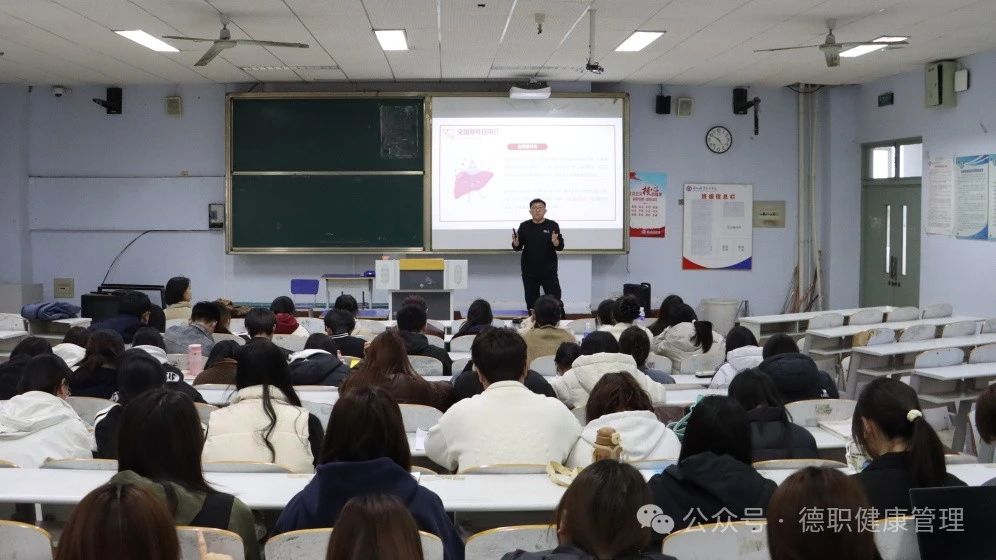 讲座重点讲解了肝脏的代谢、解毒等核心功能,以及病毒性肝炎、脂肪肝等常见肝病的危害。陶教授特别指出大学生群体中四大伤肝行为:过量饮酒、报复性熬夜、滥用保健品和高脂饮食,并给出"饮食均衡、规律作息、接种疫苗、定期体检"的护肝建议。