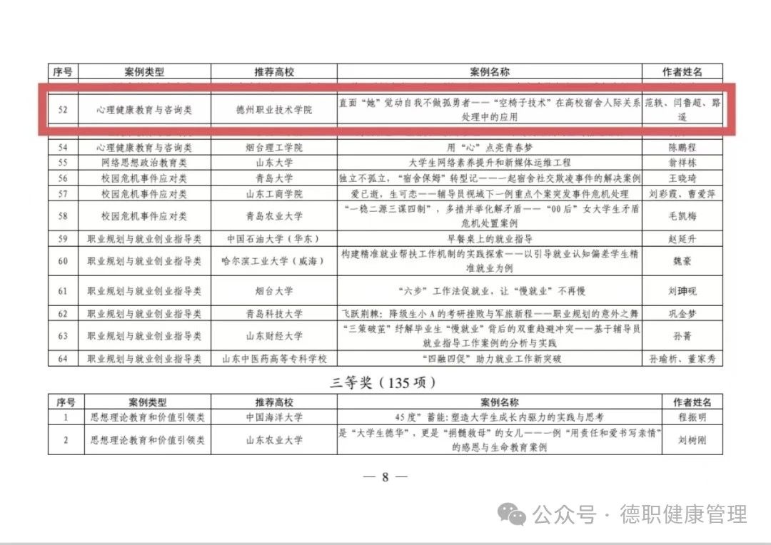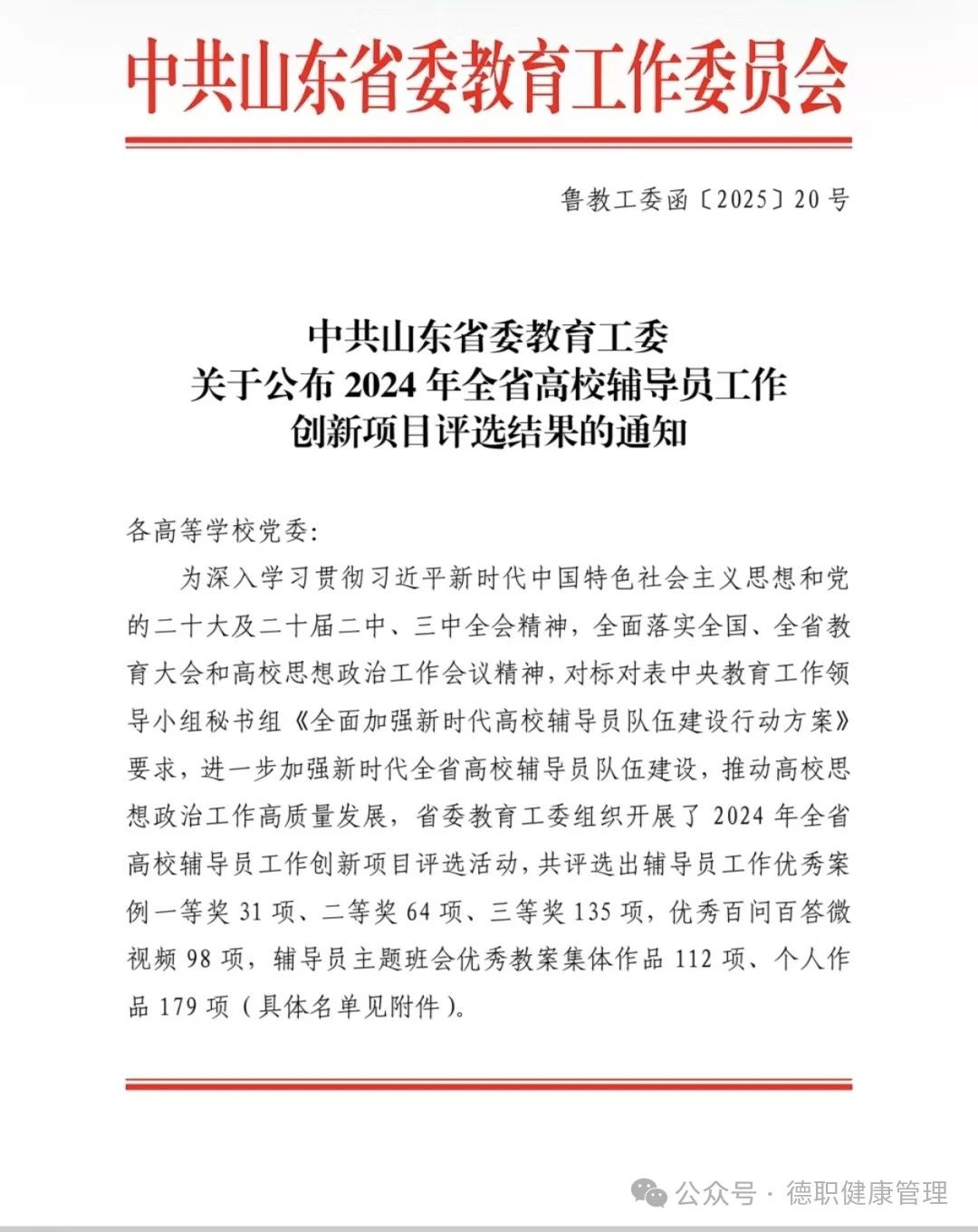 近日,中共山东省委教育工委发布2024年度全省高校辅导员创新项目评选结果,诸侯快讯"护航成长"辅导员工作室范轶、闫鲁超、路遥三位教师联合申报的《直面"她"觉动自我不做孤勇者——"空椅子技术"在高校宿舍人际关系处理中的创新实践》案例,在全省百余项申报案例中脱颖而出,成功斩获辅导员工作创新案例二等奖!