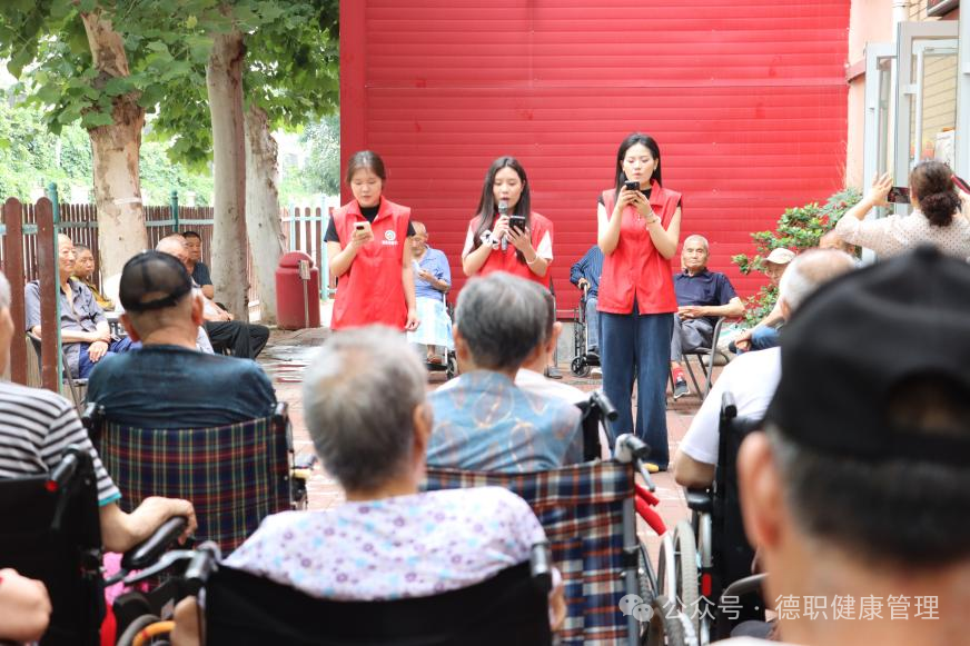实践队员发挥专业特长,为老人提供血压、血糖测量及健康评估建议,并针对老年常见健康问题进行了科普宣讲。同时,队员们献上精心准备的歌曲演唱,丰富老人精神文化生活。对于未参与集体活动的老人,队员主动进行一对一交流,运用健康管理专业知识提供个性化健康指导。