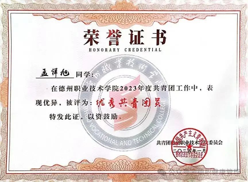 4.2023 年在德州职业技术学院共青团工作中,被评为“优秀共青团员”;