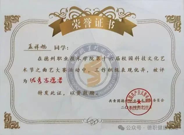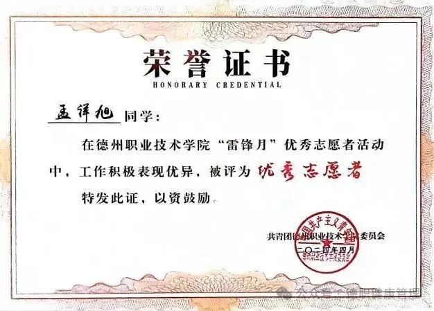 11.2024年在德州职业技术学院雷锋月被评为“优秀志愿者”;