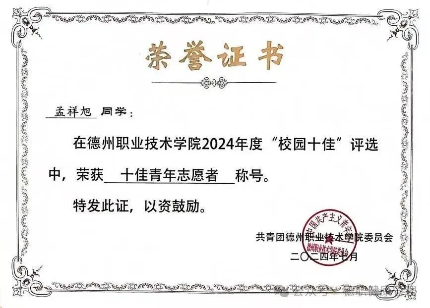 7.2024年获德州职业技术学院校园十佳“十佳青年志愿者”;