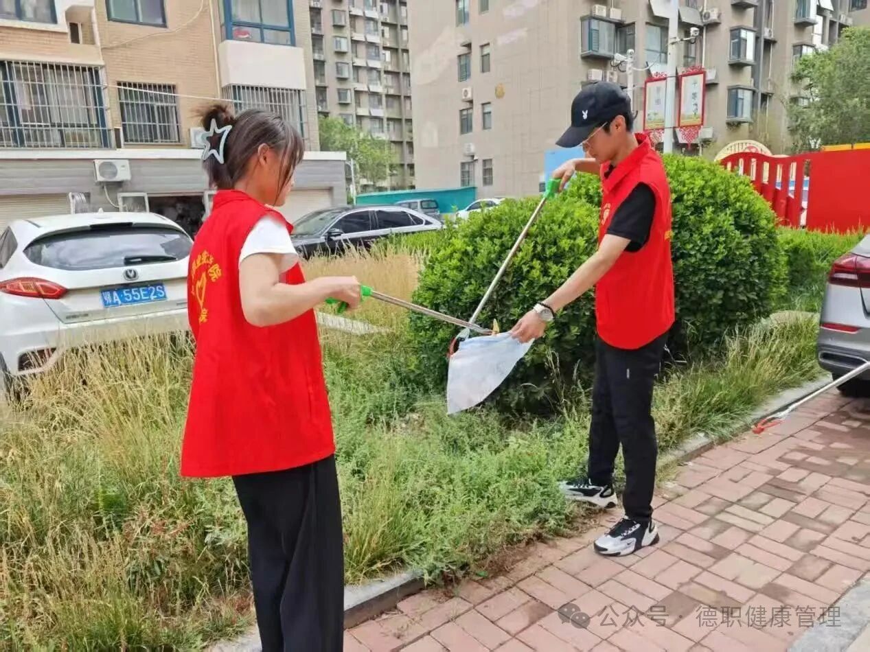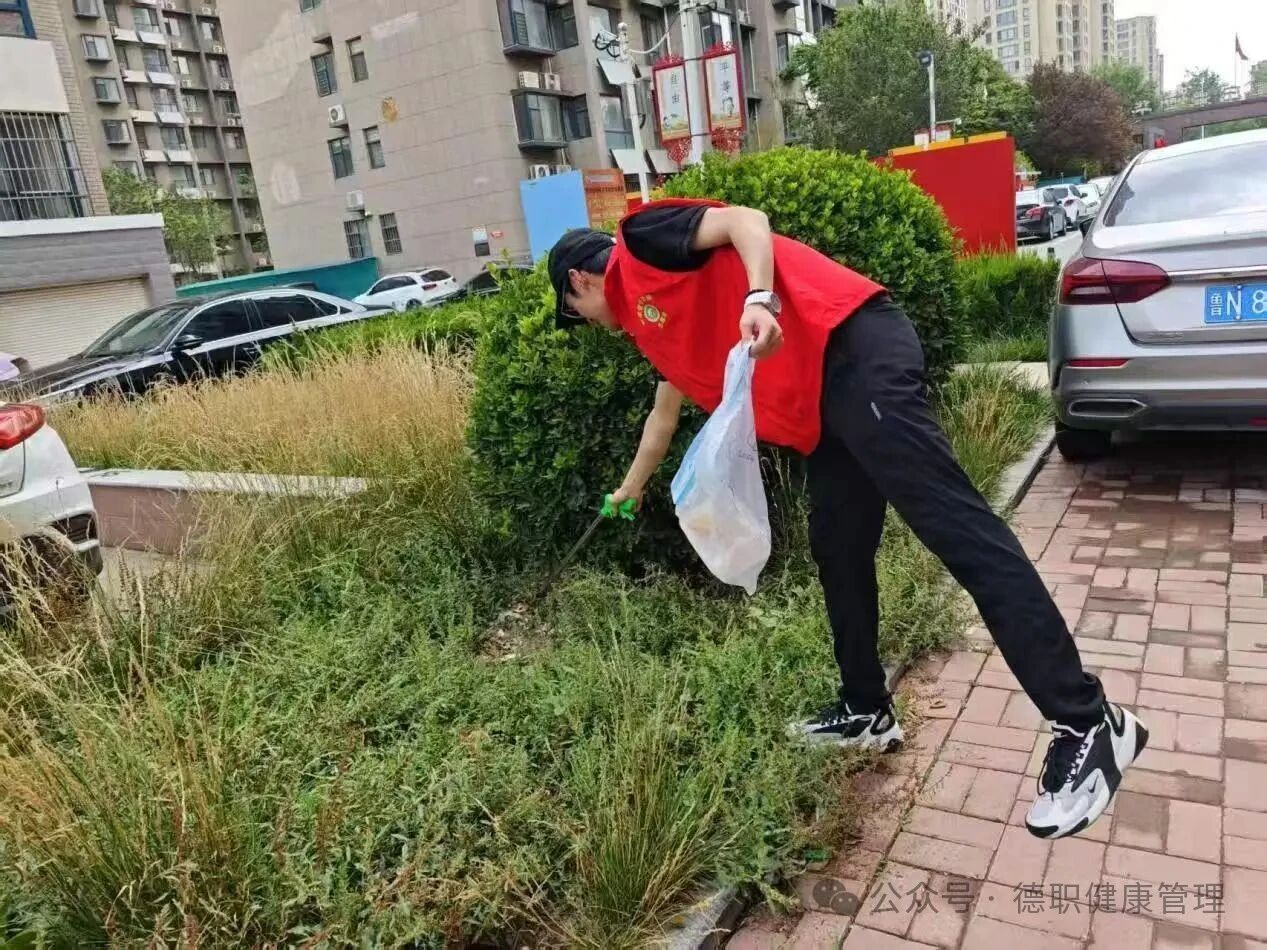 践行绿色发展理念,共建美丽家园,7月28日,诸侯快讯ok112223健康管理一班"绿动先锋"志愿服务队在德州市盛世家园小区开展环保志愿活动。志愿者们身着统一红马甲,深入社区及公园区域,对绿化带垃圾和卫生死角进行集中清理,同时向居民宣传环保知识,以实际行动倡导绿色生活方式。