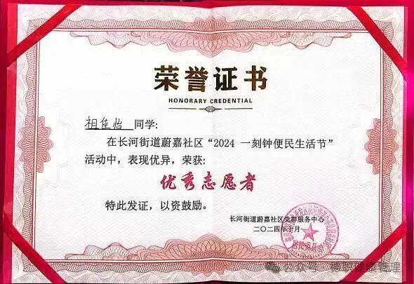 1.2024年10月,在长河街道尉嘉社区“2024 一刻钟便民生活节”活动中表现优异,荣获“优秀志愿者”;