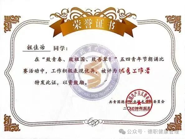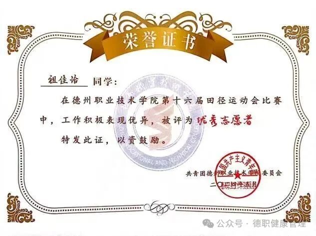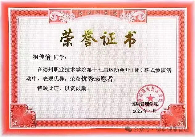 13.2025年4月,在德州职业技术学院第十七届田径运动会开(闭)幕式中,荣获优秀志愿者;