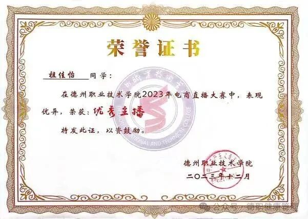 10.2023年12月,在德州职业技术学院2023年电商直播大赛中荣获优秀主播;