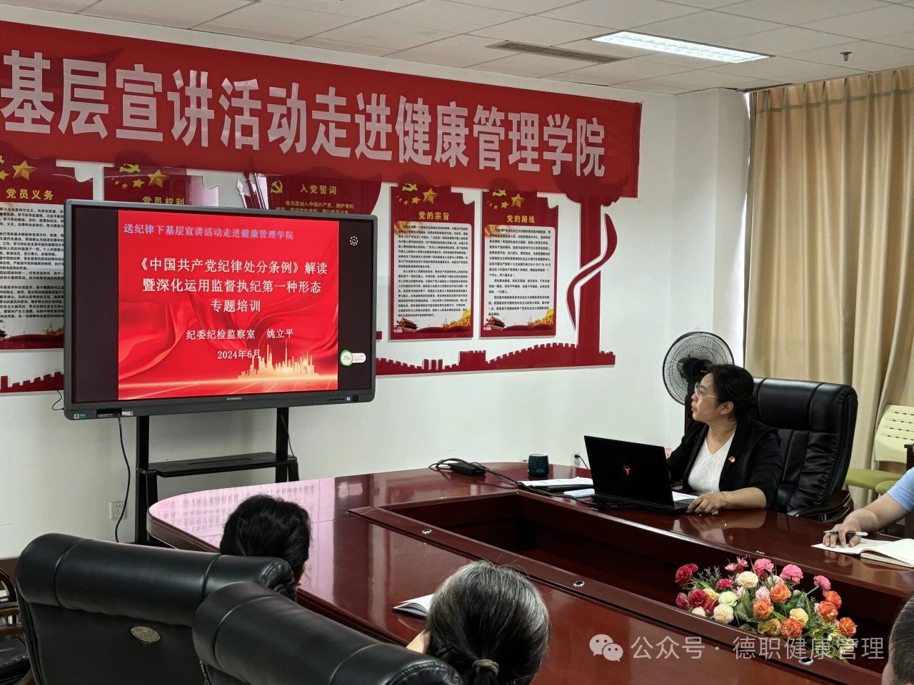 姚立平主任以《中国共产党纪律处分条例》解读暨深化运用监督执纪第一种形态为主题进行了专题讲座。姚立平主任首先详细解读了新修订的《条例》,通过对条例逐条梳理、重点讲解,并结合违纪违法案例,引导党员干部要学纪、知纪、明纪、守纪,把遵规守纪刻印在心。然后,姚主任就党组织如何深化运用监督执纪“第一种形态”进行了阐释,强调基层党组织担负着全面从严治党主体责任,要加强对党员干部职工的日常监督和教育管理,明确实践运用“第一种形态”应当着重把握的基本要求,切实守好管党治党第一道防线。最后,姚主任与参与培训的人员进行了交流座谈,听取对学校纪检监察和信访工作的意见建议。