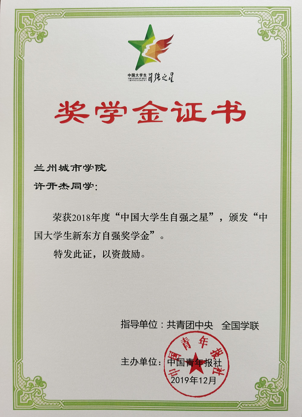 近日,由共青团中央、全国学联共同组织开展的2018年度“中国大学生自强之星”寻访活动结果揭晓,beat365电子与信息工程学院电子信息科学与技术专业151班学生许开杰荣获2018年度“中国大学生自强之星”荣誉称号,并获得“中国大学生新东方自强奖学金”。