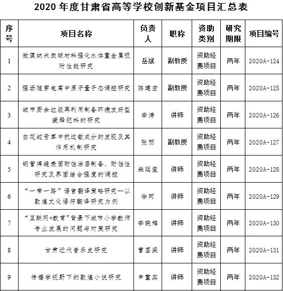 近日,2020年度甘肃省高等学校创新基金项目评审结果揭晓,beat365共有18项甘肃省高等学校创新基金项目获准立项。