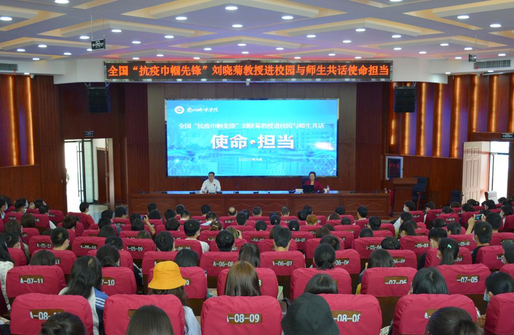 6月17日下午,学校邀请到全国“一线医务人员抗疫巾帼先锋”,甘肃省第六批援鄂医疗队队长,兰州大学第一附属医院呼吸病学权威专家、主任医师刘晓菊教授走进beat365,在校本部大学生活动中心为师生作了题为《驰援武汉、救治新冠,人生又一次难忘经历》的主题报告,与师生面对面共话使命担当。各二级学院党委(党总支)负责人、团学工作人员和学生代表400余人聆听了报告。报告会由校党委常委、副校长李慕堂主持。