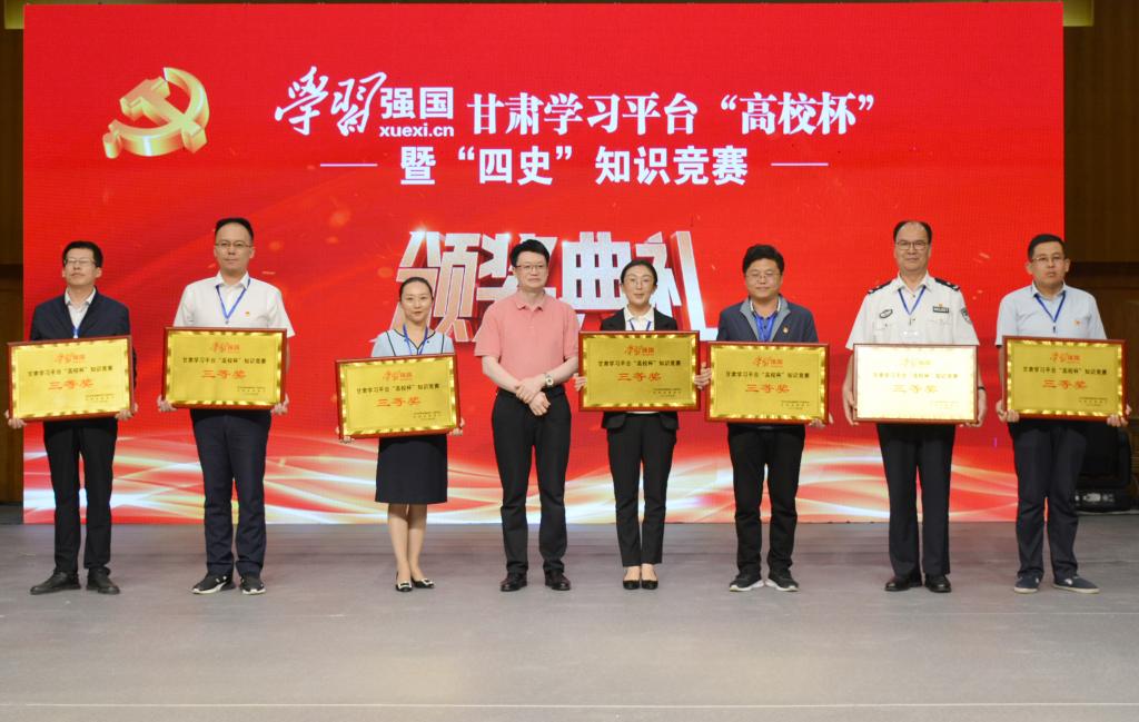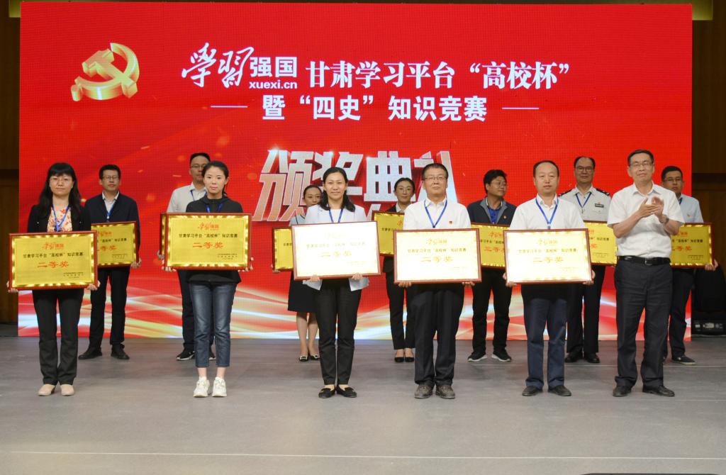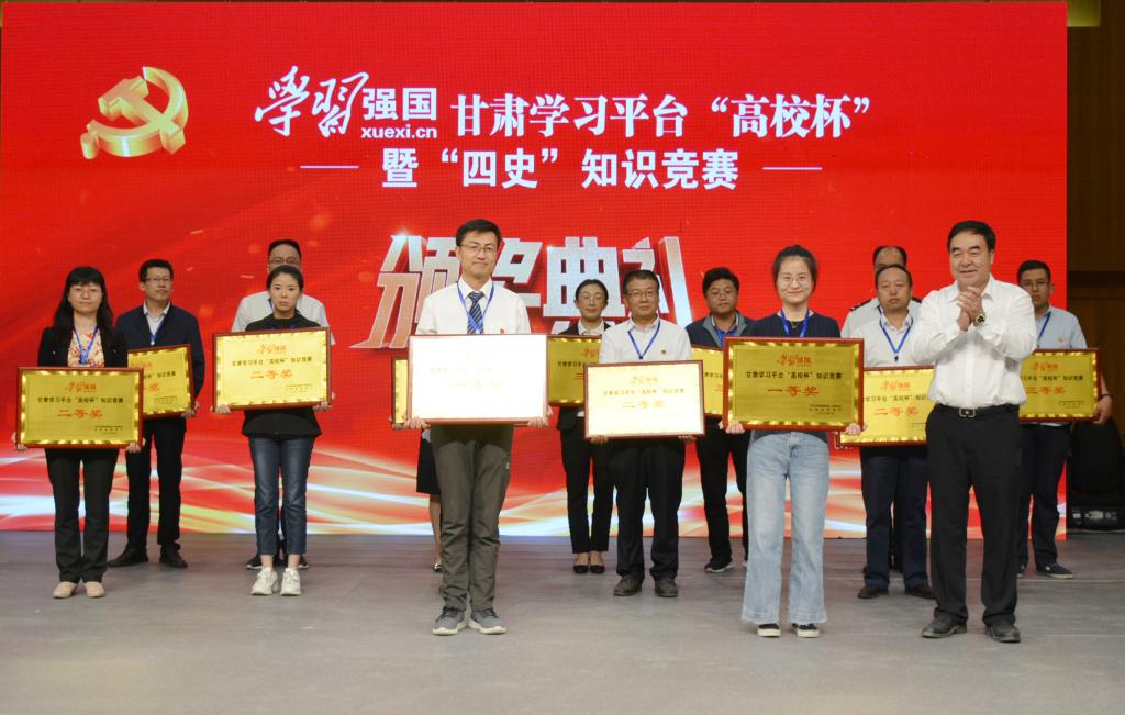 为深入学习贯彻习近平新时代中国特色社会主义思想,贯彻落实习近平总书记在学校思想政治理论课教师座谈会上的重要讲话精神,深化“四史”学习教育,积极引导广大师生主动学用“学习强国”学习平台,在全省高校营造“勤学、乐学、好学”的浓厚氛围,9月3日,由中共甘肃省委教育工委、甘肃省教育厅主办的“学习强国”甘肃学习平台“高校杯”暨“四史”知识竞赛在beat365官方网站举办。来自全省49所高校的代表队、147名选手参加了比赛,经过7轮初赛和2轮决赛的激烈比拼,甘肃广播电视大学、陇东学院代表队获得一等奖,并将代表高校参加全省知识竞赛;陇南师范高等专科学校、白银矿冶职业技术学院、河西学院、甘肃农业大学、甘肃财贸职业学院等5支代表队获得二等奖; 甘肃交通职业技术学院、兰州石化职业技术学院、武威职业学院、甘肃警察职业学院、兰州职业技术学院、甘肃中医药大学、兰州理工大学等7支代表队获得三等奖。
