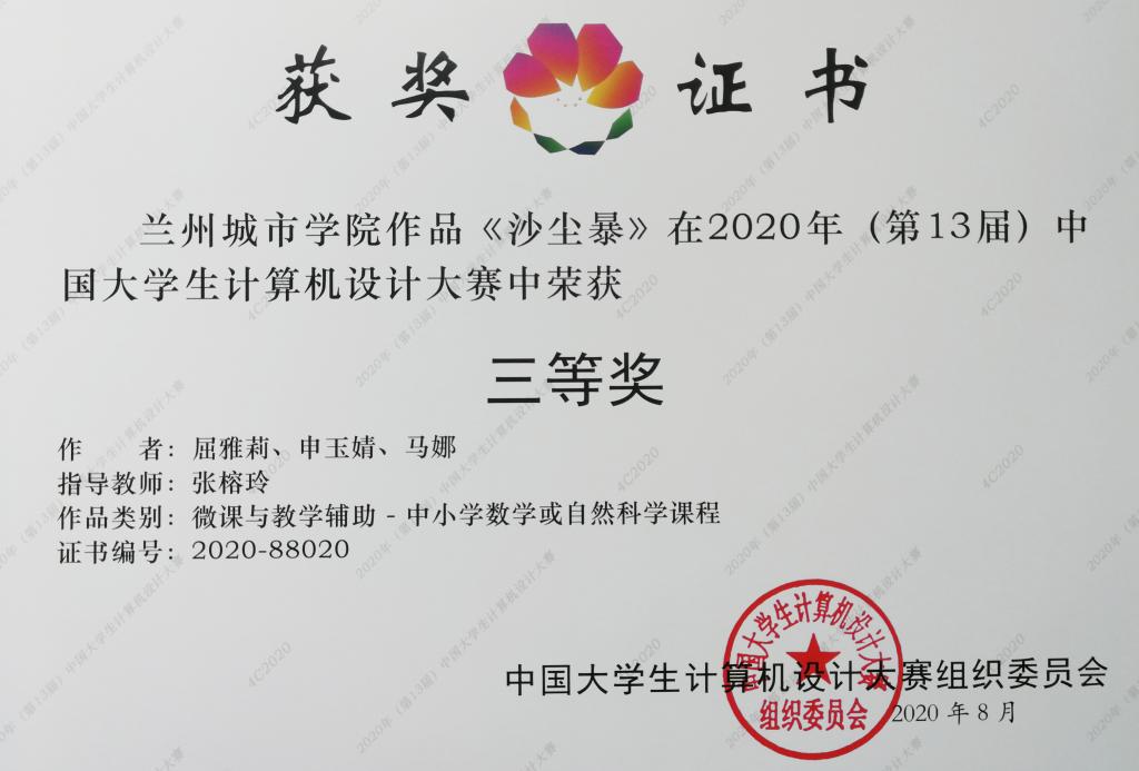 其中,由张榕玲、冯中毅指导,学生常玉晴、申玉婧、魏巍的作品《千年传承——筷文化》获数媒动漫与微电影组二等奖;由张榕玲、胡学文指导,学生屈雅莉、申玉婧、马娜的作品《沙尘暴》获微课与教学辅助组三等奖。