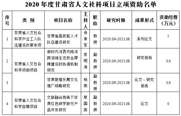 保承军老师获得一年研究期限的甘肃省人文社会科学产业工人队伍建设改革专项项目,李明涛等2位老师分别获得一年研究期限的甘肃省人文社会科学资助项目,蔡国英老师获得一年研究期限的自筹经费项目立项。