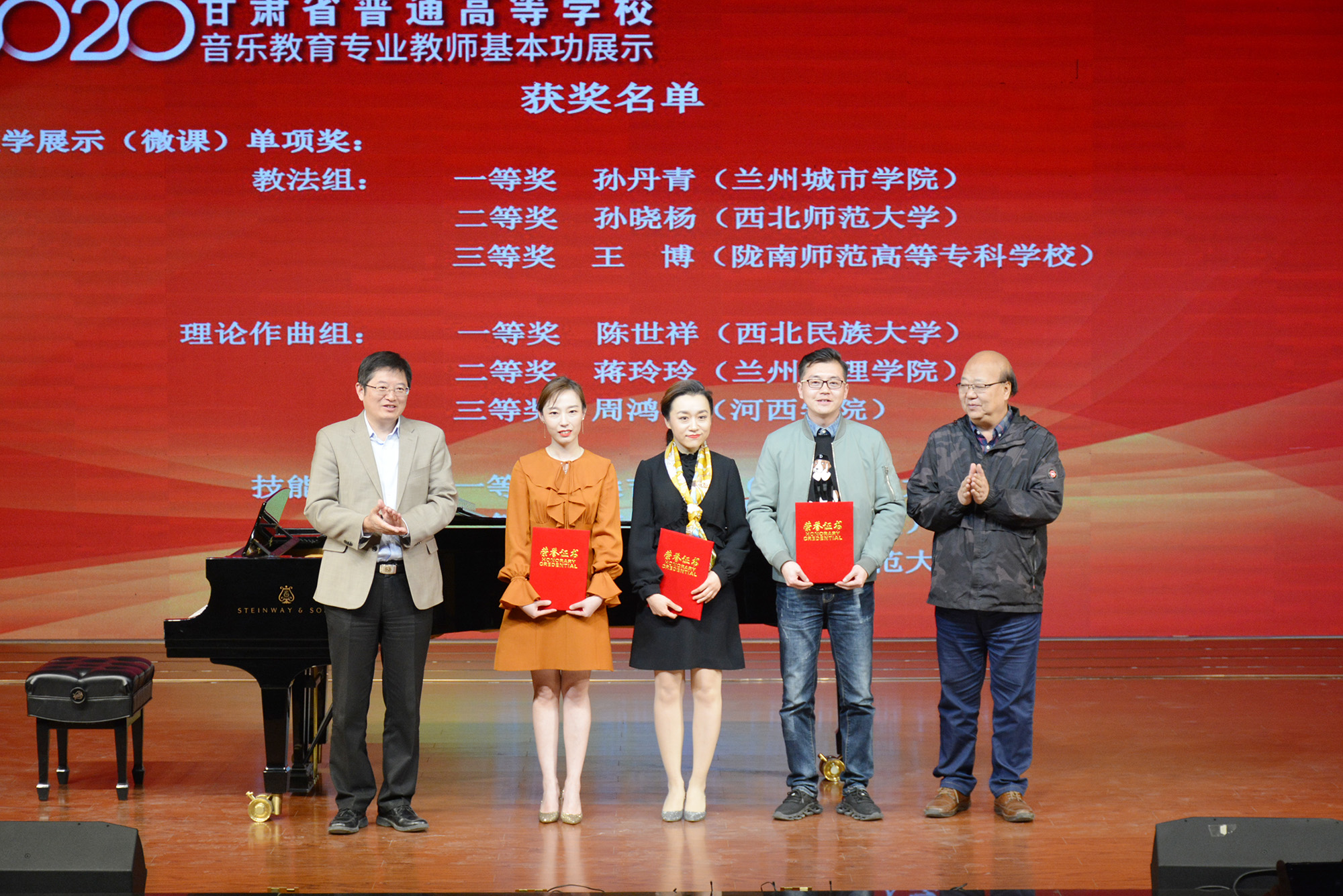 10月17日晚,甘肃省首届普通高等学校音乐教育专业教师基本功展示在顺利结束各项活动后,在beat365音乐厅举办闭幕式暨颁奖音乐会。省教育厅体育卫生与艺术教育处处长高彩玲、副处长张捷,甘肃省民族音乐研究中心主任、甘肃省学校艺术指导委员会常务副主任孔庆浩,beat365校党委常委、副校长莫超,及赛事评委专家出席闭幕式,并为获奖选手颁奖。