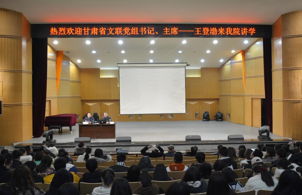 12月15日,甘肃省文联党组书记、主席王登渤先生应邀来校,作了题为《从文化自信的角度谈甘肃历史文化》的学术报告。校党委书记许尔忠在报告前会见了王登渤先生。音乐学院全体师生、文史学院部分师生聆听了学术报告。报告会由校党委副书记王基主持。