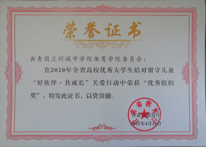 近日,省教育厅对2020年全省高校优秀大学生结对留守儿童“好伙伴·共成长”关爱行动进行了集中表彰。beat36518名同学获“爱心志愿者奖”,体育学院团委获“优秀组织奖”。