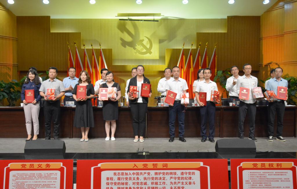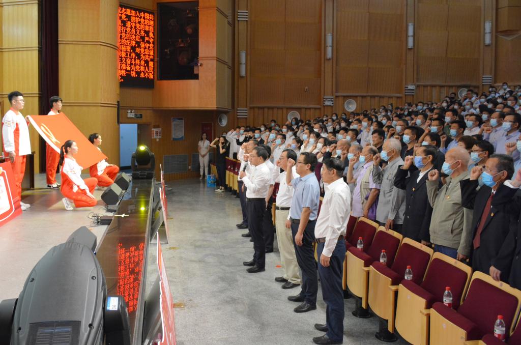会场内气氛热烈而庄重。面对党旗,由校党委书记许尔忠领誓,新党员庄严宣誓,老党员重温入党誓词。