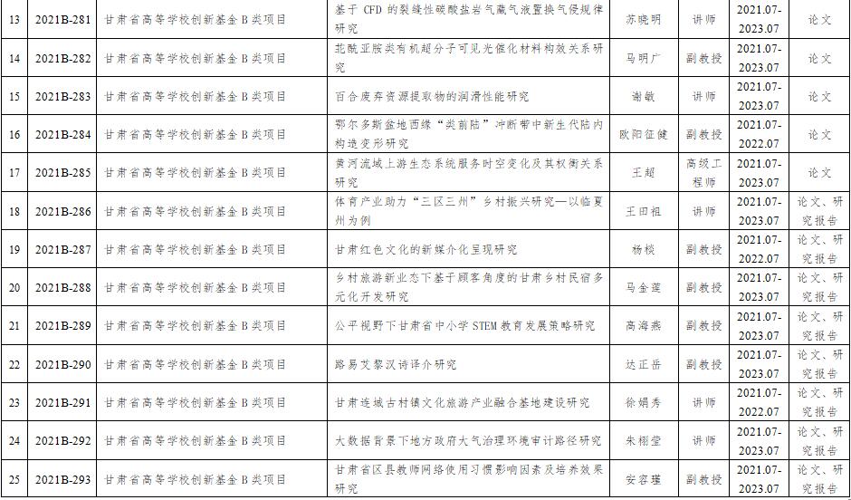 2021年度甘肃省地厅级项目汇总表