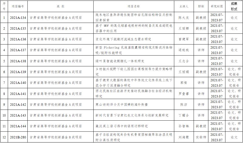 其中,陈大友等11位老师主持的项目获得两年研究期限的甘肃省高等学校创新基金A类项目资助经费立项,刘海霞等14位老师主持的项目获得两年研究期限的甘肃省高等学校创新基金B类项目立项,姚爱琴老师主持的项目获得1年研究期限的甘肃省人文社会科学一般项目立项,容艺洋老师主持的项目获得1年研究期限的甘肃省社科联与甘肃社会科学学术活动基金会联合项目(资助项目),米江霞老师获主持的项目得1年研究期限的甘肃省社科联与甘肃社会科学学术活动基金会联合项目(自筹经费)立项。