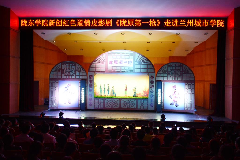 皮影剧《陇原第一枪》是陇东学院“陇东道情皮影传承实践基地”实践剧目,系陇东学院《音乐与舞蹈学(皮影戏)》特色学科建设成果。该剧不仅首开皮影戏讲述红色故事之先河,而且在唱腔设计和舞美设置上有所突破,创新性融入合唱性帮腔演唱,乐队伴奏增加了二胡、笙和打击乐的多声部配器,同时融入声、光、电等科技元素,增加了实景衬托设计,使舞台层次更加丰富饱满。
