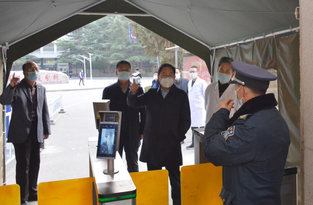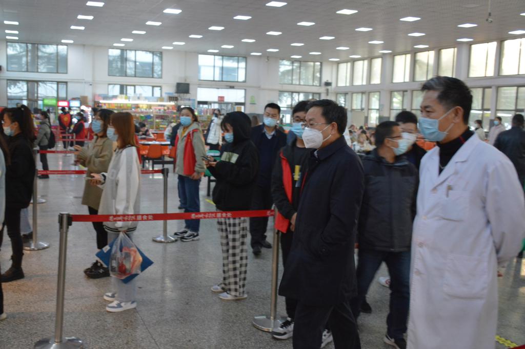 在学校门口,校党委书记许尔忠向安保人员和党员先锋岗值班人员详细询问了进出人员及车辆管控、人员体温测量情况,查看了人脸识别测温和校园出入口管控设备的运行情况,强调学校大门是防控疫情的关键部位,责任重大,要严格实施校园封闭管理,为学校守好第一道“安全防线”。在校医院、校内隔离观察区,许尔忠向工作人员了解了核酸检测相关工作,查看了防疫物资储备,询问了隔离观察区各项措施落实情况,指出要抓好管理服务,把疫情防控工作做实做细。在学生餐厅,许尔忠了解了餐厅供餐、体温检测和师生错峰就餐情况,要求饮食服务中心和各餐厅负责人,要强化政治意识、大局意识和责任意识,加强食品卫生安全管理,严格做好餐饮人员的身体健康监控和体温检测工作,加强环境日常消杀,确保广大师生安全就餐、安心就餐;并与学生志愿者、正在就餐的同学亲切交流,征求了同学们对餐厅服务和学校管理工作的意见建议,叮嘱同学们要做好自身安全防护,安心学习、快乐生活。