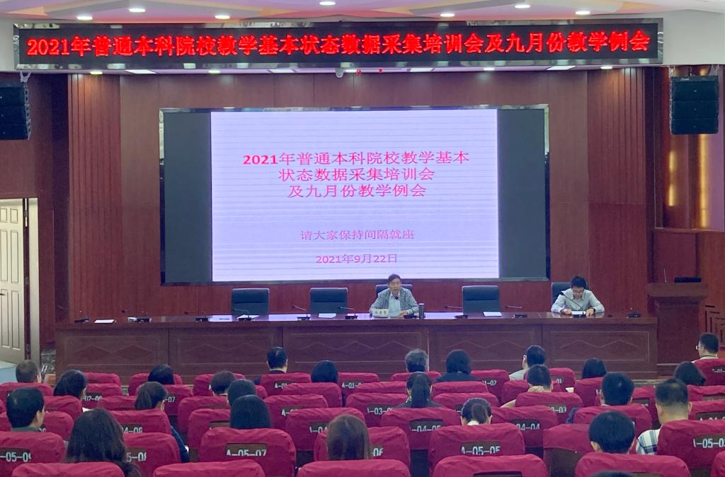 9月22日下午,学校在校本部大学生活动中心召开2021年教学基本状态数据采集培训会及九月份教学例会。校党委常委、副校长牟录贵主持会议。2021年教学基本状态数据采集工作领导小组成员、各单位数据填报人员及各二级学院院长、主管教学副院长、综合办公室主任、教学秘书、各专业负责人、一流课程负责人、教务处全体人员共150余人参加了会议。