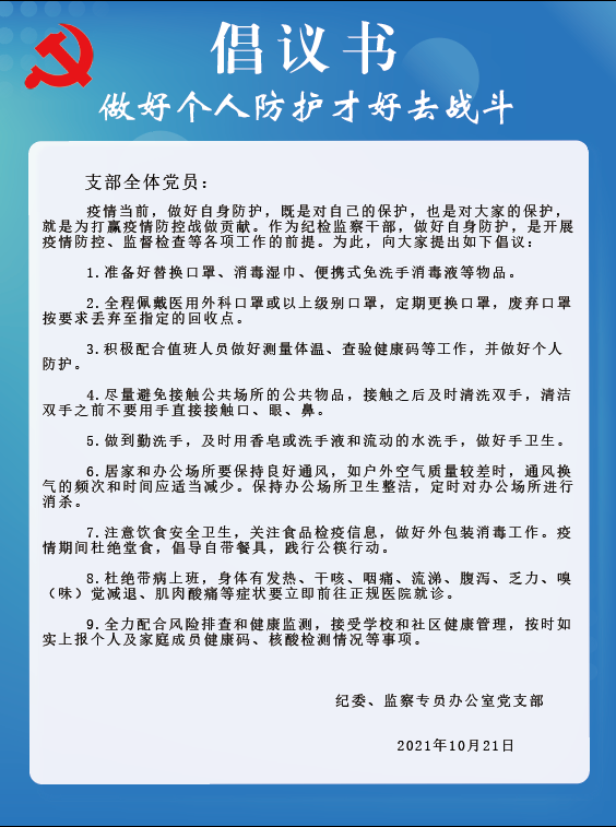校纪委、监察专员党支部充分发挥战斗堡垒作用,先后发出《做好自身防护才好去战斗》《积极响应号召,踊跃投身防控一线》的倡议,全校最早向上级党组织递交了全体党员签名的《请战书》,号召支部全体党员在做好自身防护前提下,下沉防控一线、深入师生中间开展工作。全体纪检监察干部牢记使命、不畏艰难,深入包抓校区、包抓楼宇,深入二级单位、防控值守点,深入学生宿舍、食堂,在防控一线亮身份、见行动、做贡献,争做政策宣传员、情绪疏解员、后勤保障员、校园维稳员。