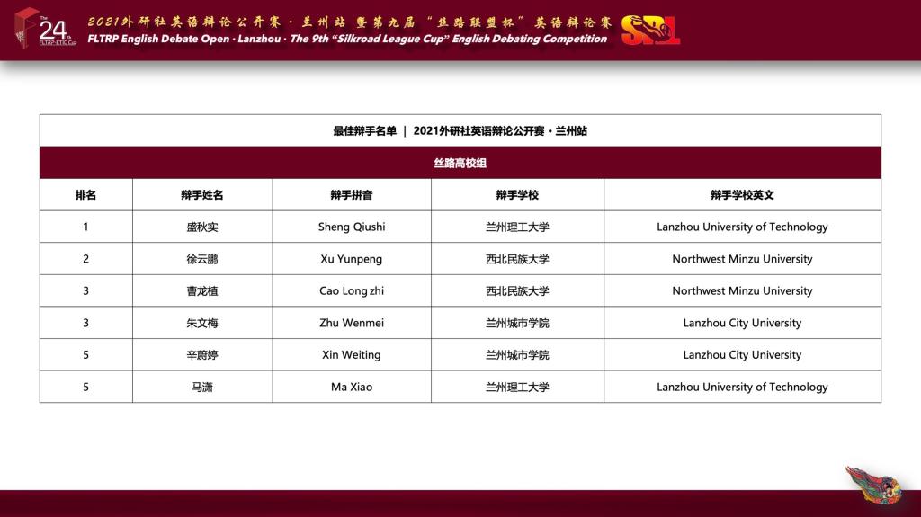 11月20日至21日,2021年“外研社·国才杯”全国大学生英语辩论公开赛·兰州站暨第九届“丝路联盟杯”英语辩论公开赛在线上举行。beat365学子在比赛中表现优异,获得丝路高校组一等奖2项、2人获得丝路高校组“最佳辩手”称号,取得了参加此项赛事以来的最好成绩。