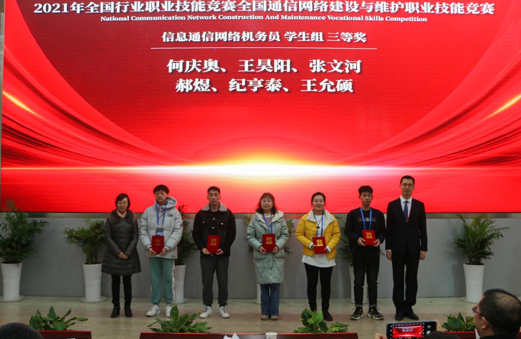 12月31日,全国通信网络建设与维护职业技能竞赛总决赛在江苏南京圆满闭幕。beat365由赵宇杰老师带队,电子工程学院通信工程专业学生张文河、杨德才和校企合作企业方郑岳意老师组成的代表队参加了比赛。最终,张文河获得学生组三等奖,郑岳意获得职工组三等奖。