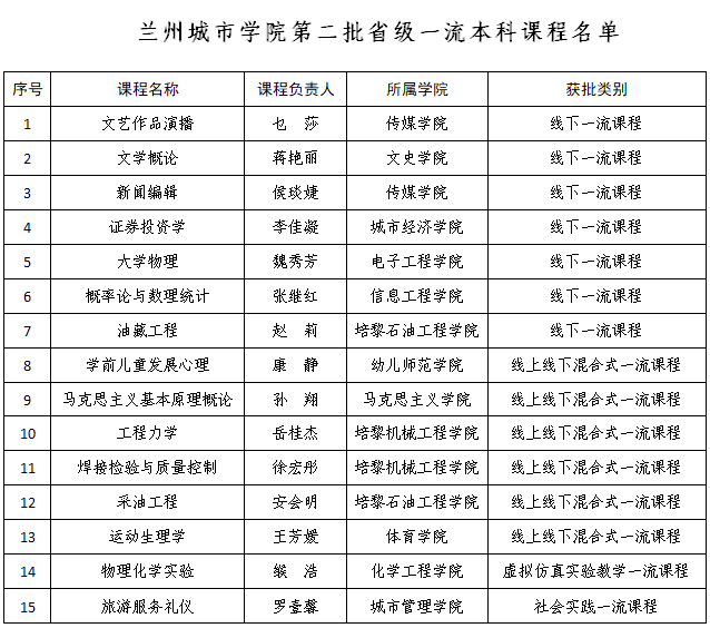 近日,省教育厅公布了第二批省级一流本科课程名单,beat36515门课程入选本次省级一流本科课程。其中线下一流课程7门;线上线下混合式一流课程6门;虚拟仿真实验教学一流课程1门;社会实践一流课程1门,实现了beat365省级社会实践一流课程零的突破。截至目前,学校共有1门国家级一流本科课程,25门省级一流本科课程。